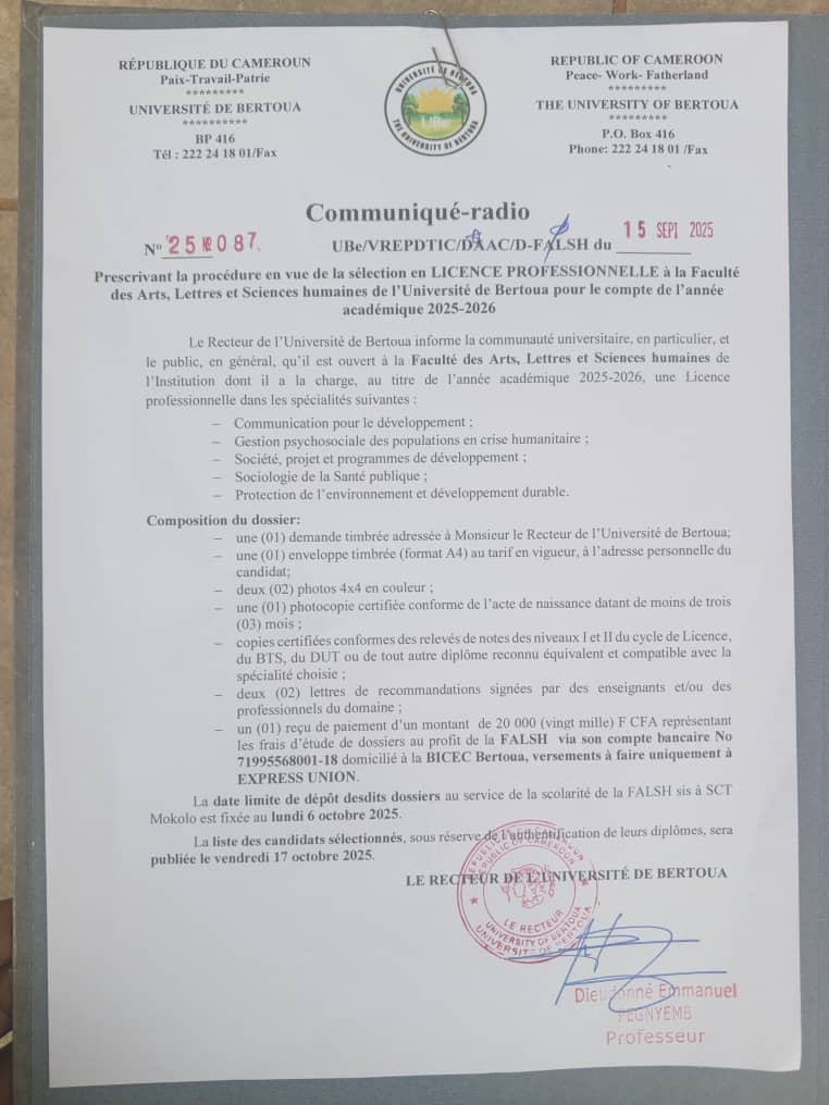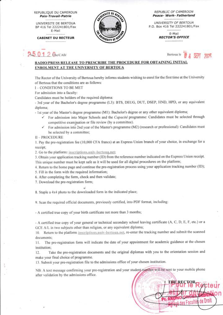 PREINSCRIPTION 2025-2026 ENGLISH VERSION SIC-UBe 2025-09-05 THE ENGLISH VERSION OF THE PROCEDURE FOR OBTAINING AN INITIAL REGISTRATION AT THE UNIVERSITY OF BERTOUA.