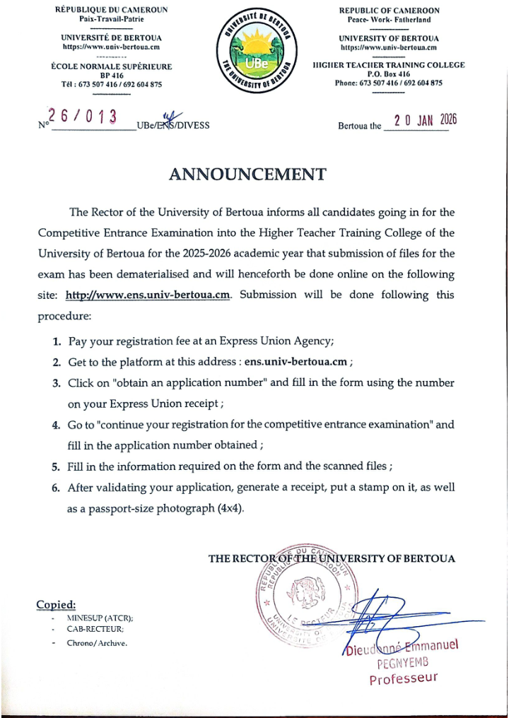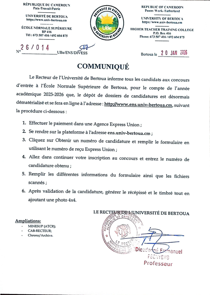 APPEL À CANDIDATURE POUR L'INSCRIPTION EN PREMIÈRE ANNÉE DE DOCTORAT PhD À L'UNIVERSITÉ DE BERTOUA (FR)
